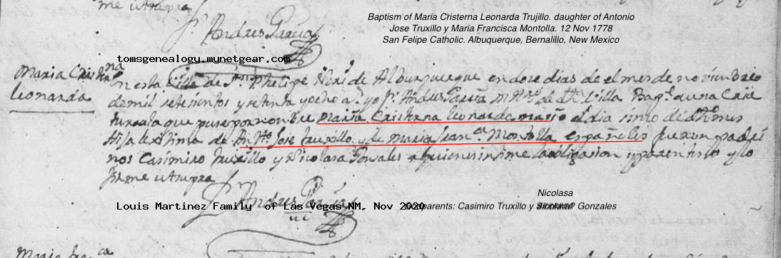 Maria Cristerna Leonarda TRUJILLO Baptism: November 12, 1778 — San Felipe Catholic. Albuquerque, Bernalillo, New Mexico |
