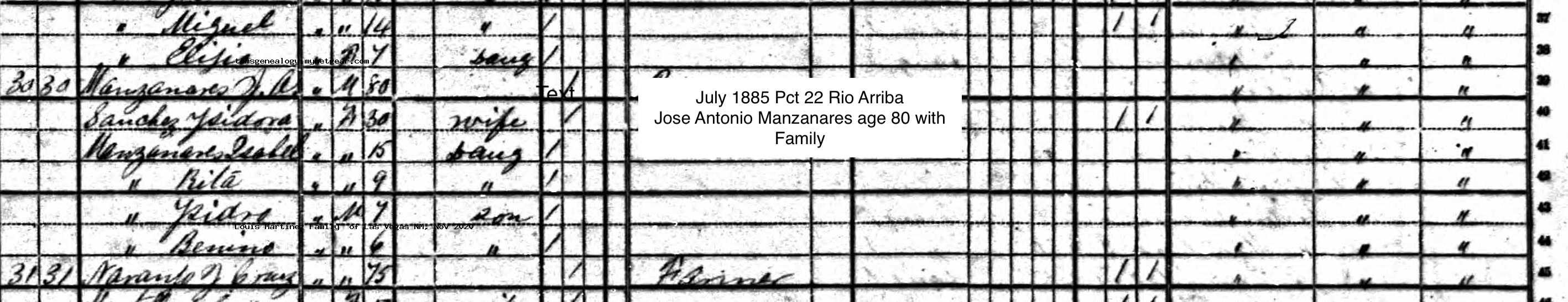 Census | 1880 1880 Census Abiquiu NM, Manzanares Families Note: On the same page, the census lists families of Benino, his father Juan Francisco , and his grandfather Antonio (all) Manzanares. It also shows Antonio, at the age of 80, had a new wife Isidora and two small children.