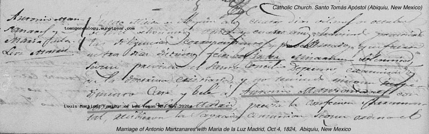 | Marriage | Name Antonio Mansanares Spouse's Name Maria De Luz Madrid Event Date 04 Oct 1824 Event Place Santo Tomás Apóstol, Abiquiu, Rio Arriba, New Mexico citing reference - FHL microfilm 16,621. |