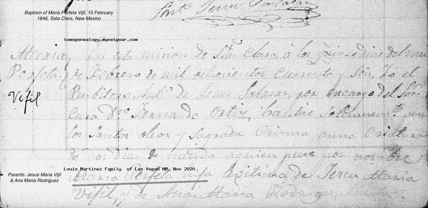 Maria Perfecta VIGIL Baptism: February 10, 1846 21 — Holy Cross Catholic, Santa Clara, Rio Arriba, New Mexico |