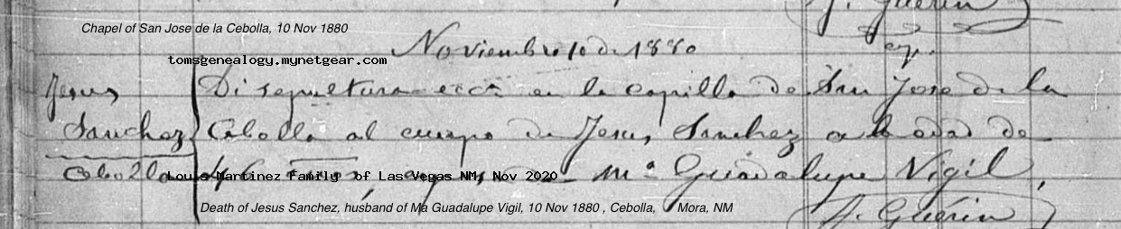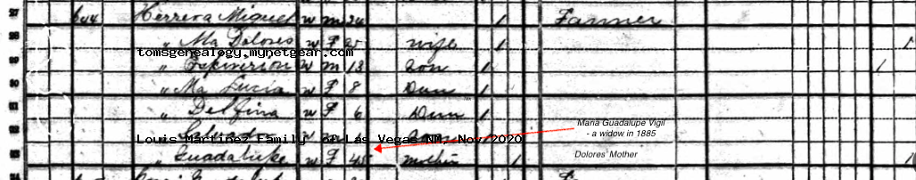 | Census | Guadalupe Vigil is living with her daughter Dolores SANCHEZ Herera. She is a widow; Jesus Sanchez died in 1880. |
