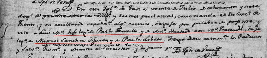 Marriage of a child | Maria Luis TRUJILLO — Maria Gertrudis SANCHES — View this family July 20, 1807 (Age 39 years) Note: Marriage record states Miguel Sanchez was deceased.