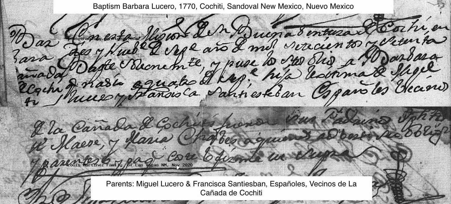 Barbara LUCERO Baptism: September 19, 1770 — Catholic, Cochiti, Sandoval, New Mexico Death: after 1845 — Abiquiu, Rio Arriba, New Mexico Territory |