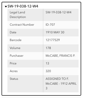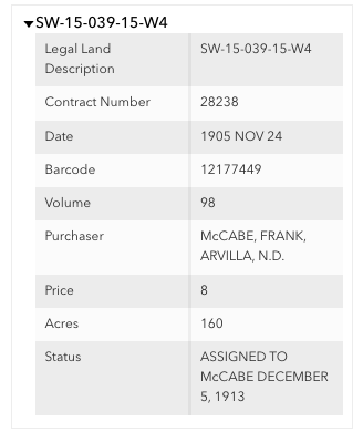 | Immigration | Frank and his brother Ben bought land in Alberta. Later Frank moved to Alberta to farm the wheat land there. Life was tough on the prairie -the family sod house burned down, Frank's father died while they were in Canada and finally, Dolores had to return to Larimore in 1913 to have their third child Frances. Soon after, Frank also returned to the farm in Hegton township outside Larimore. The land records for Frank and Ben's purchases can be found at the Glenbow Museum in Canada. http://ww2.glenbow.org/search/archivesCPRSearch.aspx Frank had SW 15-39-15-W4 (160 acres) and NW?SW 19-38-12-W4 (320 acres) |