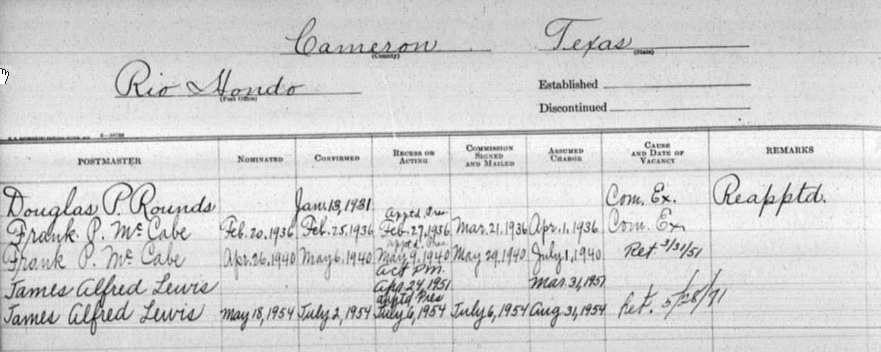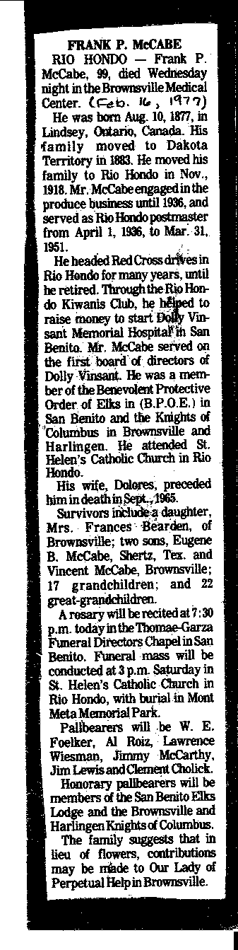 | Occupation | Frank McCabe was a prominent Democrat and was appointed postmaster at Rio Hondo Tx from 1936 to 1951. |