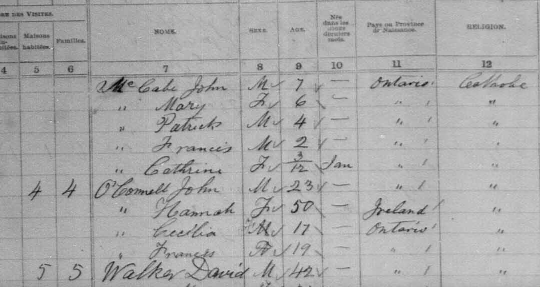 | Census | Micheal McCabe M 40y Ireland Mary McCabe F 30y Ontario Thomas McCabe M 16y Ontario Margret McCabe F 14y Ontario James McCabe M 12y Ontario Anney McCabe F 9y Ontario John McCabe M 7y Ontario Mary McCabe F 6y Ontario Patrick McCabe M 4y Ontario Francis McCabe M 2y Ontario Cathrine McCabe F 3m Ontario |