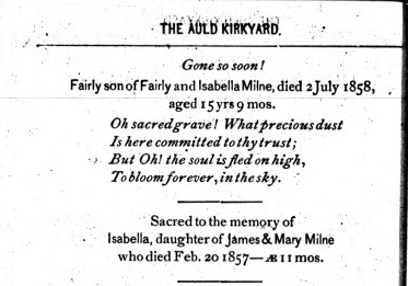 Death of a brother | Fairley MILNE Jr July 2, 1858 (Age 12 years) |