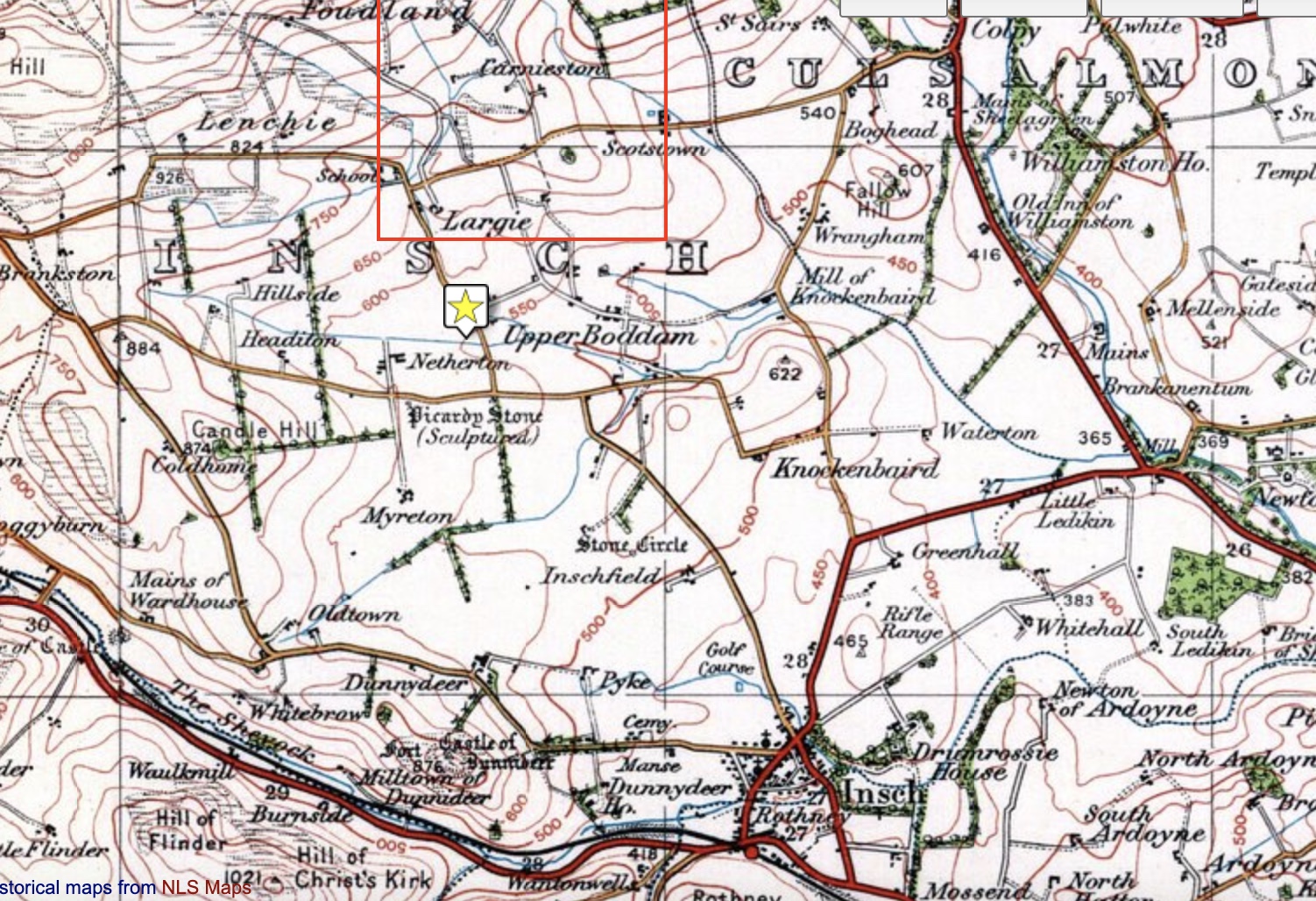 | Residence | Two of John and Margaret's children were baptized in Insch and the baptism records stated they lived in Cairneston. Cairneston no longer exists and is not on modern maps but historical maps show that it was north of Insch and NE of the present village of Largie. It is a group of farms on hills north and east of Largie. The south foot of Cairneston is located at gps 57.374491, -2.637411. (Note, other historical spellings: Cairnieston, Carnieston ) |