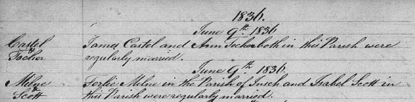 | Residence | Documents indicate that the family of John Milne and Margaret Anderson lived in Cairneston (northwest of Insch town) from at least 1820 through 1829. The earliest record was the 1820 baptism record of their son David Milne of Cairneston and the last was a baptism record of 1829 in which John Milne of Cairneston was a witness. |