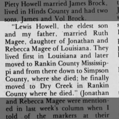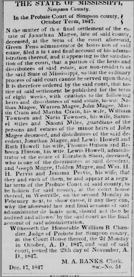 | Probate | The probate of Jonathan Magee's estate lasted for almost a decade. Several newspaper articles announcing probate stages appeared in the Jackson MS newspaper. The final series of announcements listed heirs and distributees but did not state the family relationships. It appears that the list starts with children of Evan Magee (deceased) and ends with living children of Jonathan. It also seems to have confused the name John Magee with Evan Magee (deceased.) However Evan Magee was also known as Evan J Magee so, perhaps, Evan's middle name was John and was sometimes called John. To wit: Nathan, Warren, John Magee, Martha Crain, Nariza Townsend are all children of Evan Magee deceased. Naomi Miles was widow of Evan Magee. Elizabeth Short, Ruth Howell, Rebecca Hutson, Joseph & Holden Magee, Jemina Pervis were all children of Jonathan Magee. |