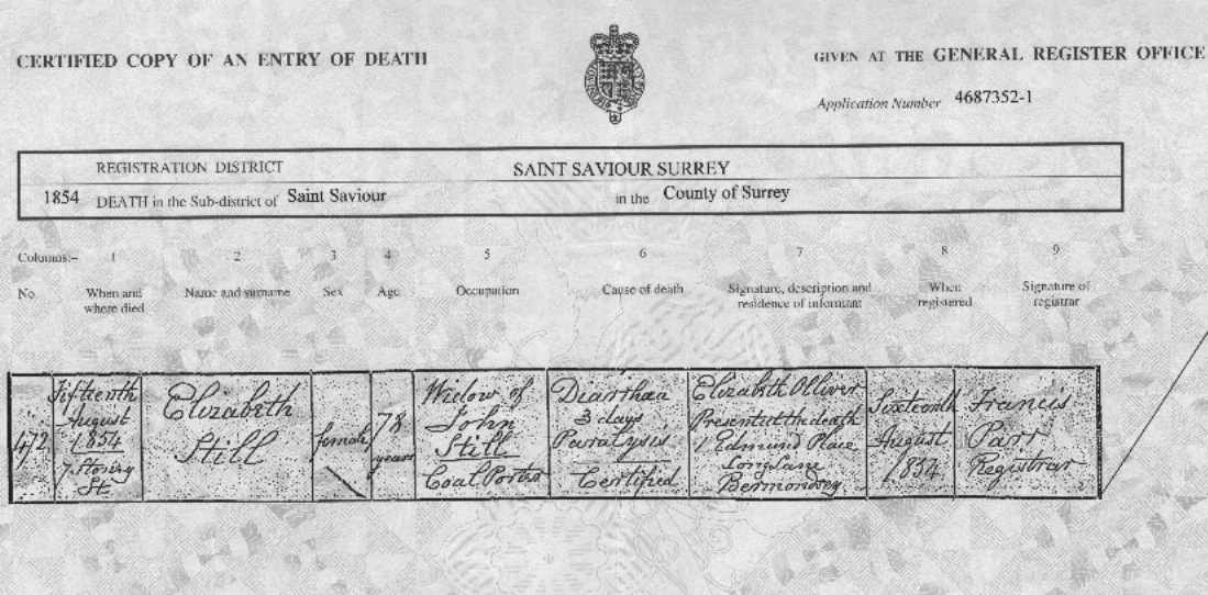 Death of a paternal grandmother | Elizabeth … August 15, 1854 (Age 13 years) Age: 78 Address: 7 Stoney St Note: Death Certificate states she was widow of John Still, Coal Porter. Information provided by (her daughter) Elizabeth Olliver, 1 Edmund Place, Long Lane, Bermondsey.