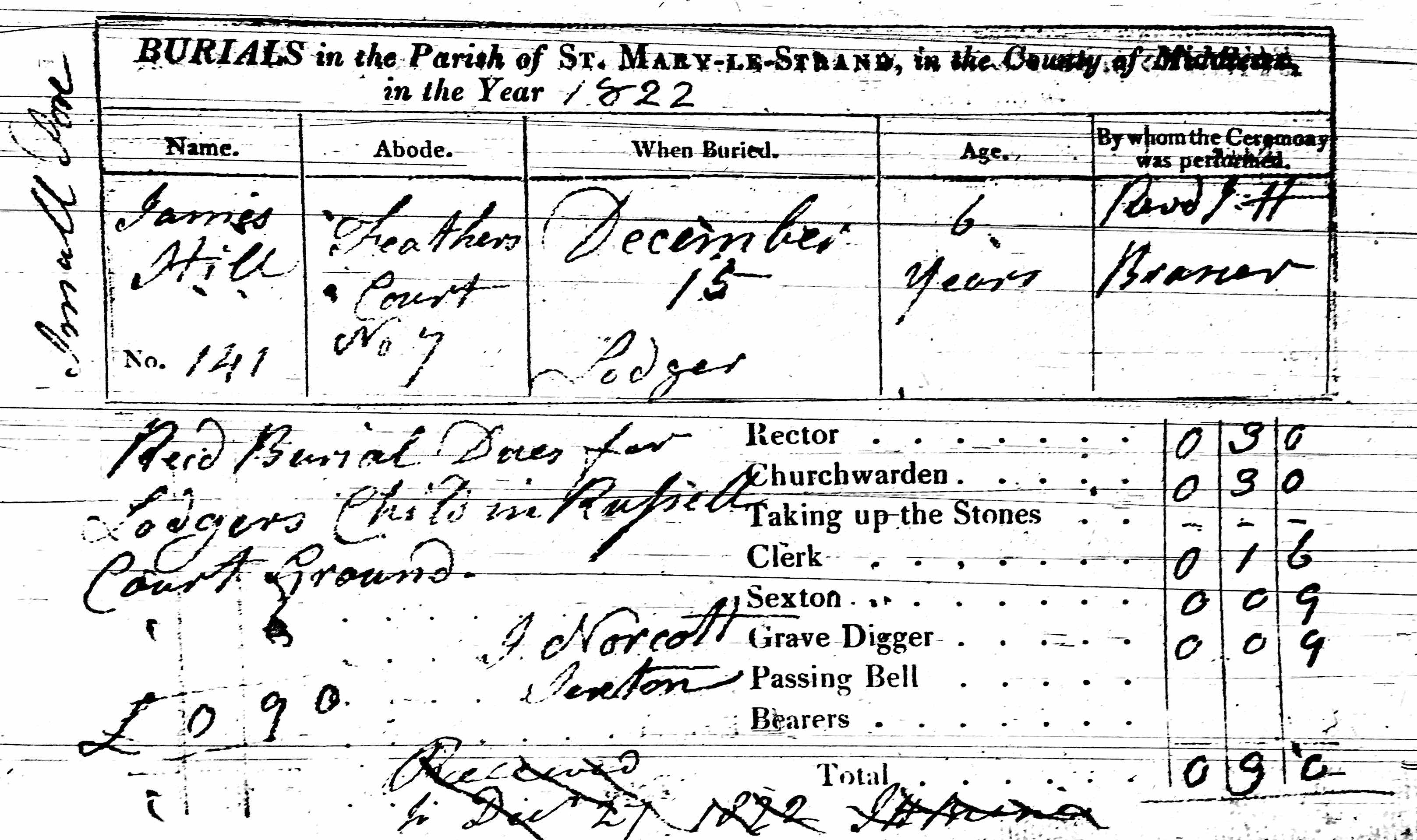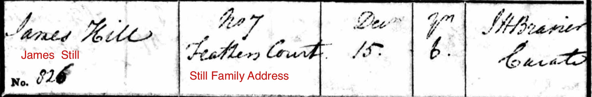 Death of a brother | James STILL December 15, 1822 (Age 7 years) Age: 6 Note: Burial record for James Still , age 6, of 7 Feathers Court, the address of the John Still family in other parish records of St Mary le Strand. The 15 Dec 1822 entry seems to clearly be Hill but another record found in the Westminster Archives shows the name is James Still with abode 7 Feathers Court. (Film Roll 20 of St Mary Le Strand Records, Westminster Archives,London.)