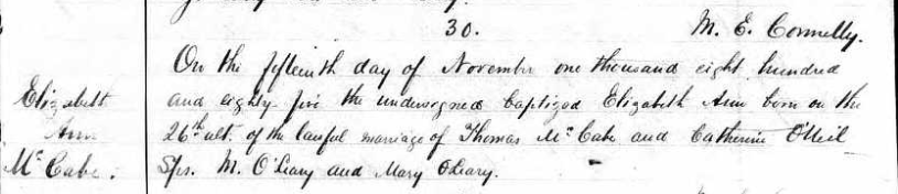 Birth of a daughter#6 | Elizabeth Ann McCABE October 26, 1885 (Age 34 years) Note: From Baptism record.
