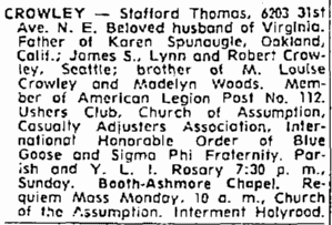 Death of a brother | Stafford Thomas CROWLEY July 12, 1962 (Age 49 years) |