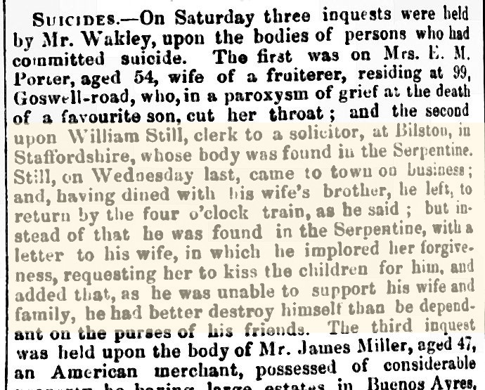 Death of a brother | William STILL October 24, 1849 (Age 33 years) Cause: Suicide by Drowning Newspaper Article About William's Suicide Note: The Globe, Monday Oct 29, 1849 (London Paper)