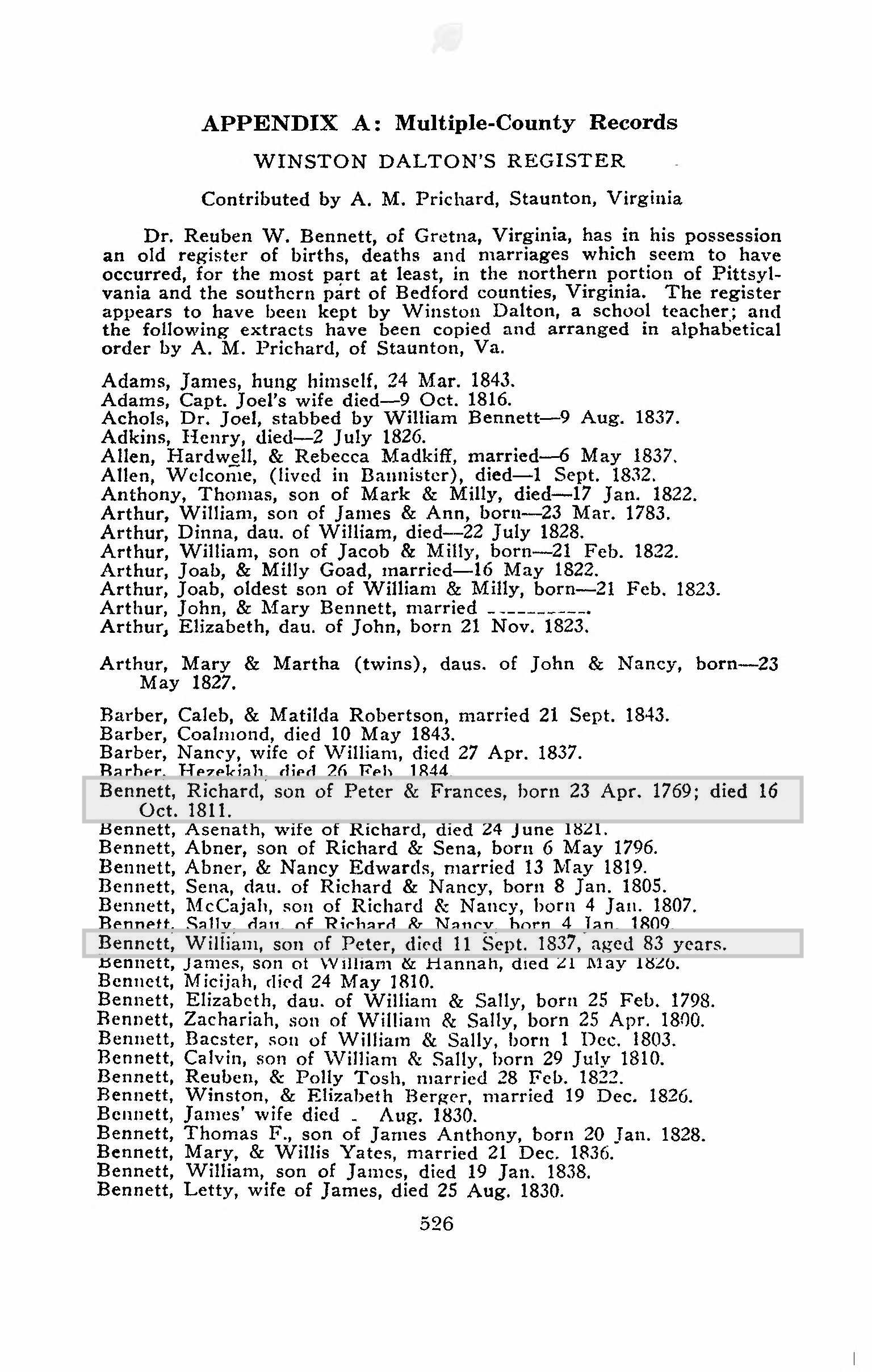 Copied from Bennett Genforum. Don Bennett gives some details of William Bennetts family in Pittsylvania Co Va.