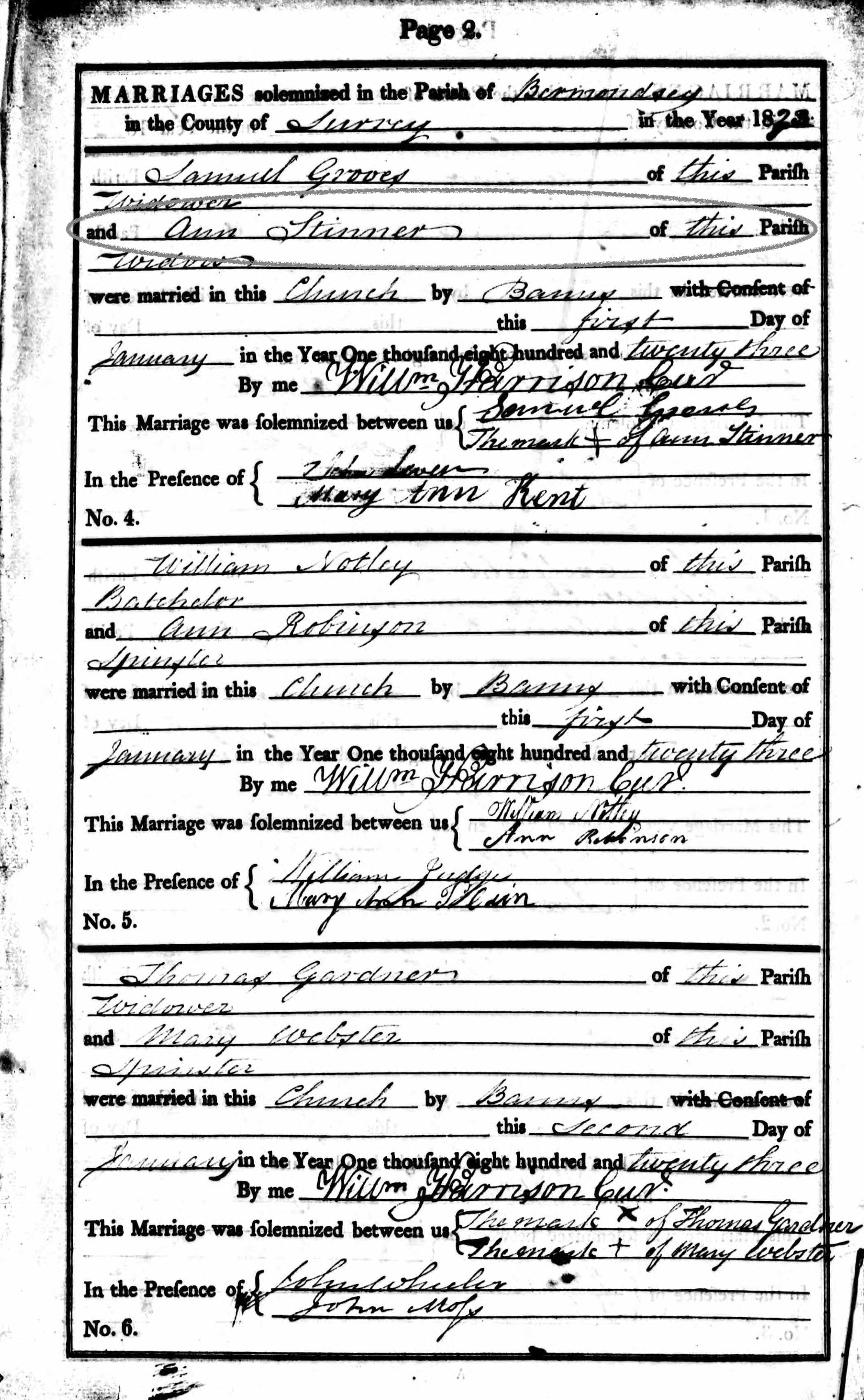 | Marriage | From London, England, Church of England Marriages and Banns, 1754-1931 Name: Ann Stinner Marriage Date: 1 Jan 1823 Marriage Place: St Mary Magdalene, Bermondsey, Southwark, England Spouse: Samuel Groves Register Type: Parish Register |