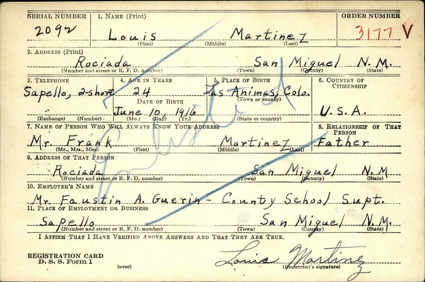 | Census | 1940 United States Federal Census For Louis Martinez Birthplace: New Mexico Marital status: Single Home in 1940: Canon De Manuelitas, San Miguel, New Mexico Map of Home in 1940: View Map Inferred Residence in 1935: Canon De Manuelitas, San Miguel, New Mexico Residence in 1935: Same House Occupation: Farmer Attended School or College: No Highest Grade Completed: High School, 2nd year Hours Worked Week Prior to Census: 48 Class of Worker: Wage or salary worker in private work Frank Martinez 42 Tillie R Martinez 41 Louis Martinez 22 son Leo Martinez 16 |
