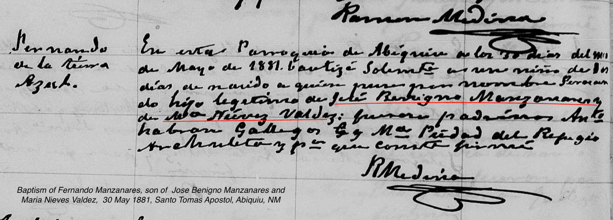 Jose Fabian MANZANARES Baptism: April 15, 1899 38 33 — Santo Tomás Apóstol, Abiquiu, Rio Arriba, New Mexico |