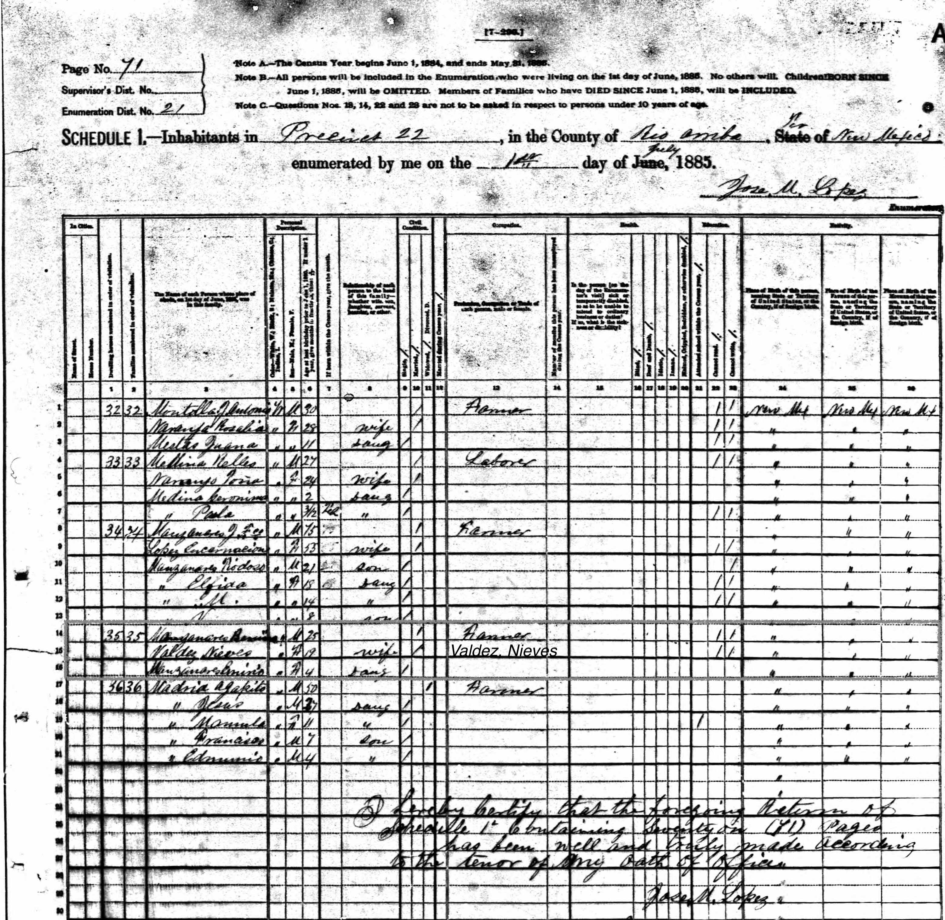 | Census | New Mexico Territorial Census, 1885 For Benino Manzanares Age: 25 Birth Date: abt 1860 Birth Place: New Mexico Enumeration District: 21 Residence: Precinct 22, Rio Arriba Relation to Head: Head Marital status: Married Father's Birth Place: New Mexico Mother's Birth Place: New Mexico Benino Manzanares Head Nieves Valdes Wife Benino Manzanares Daughter |