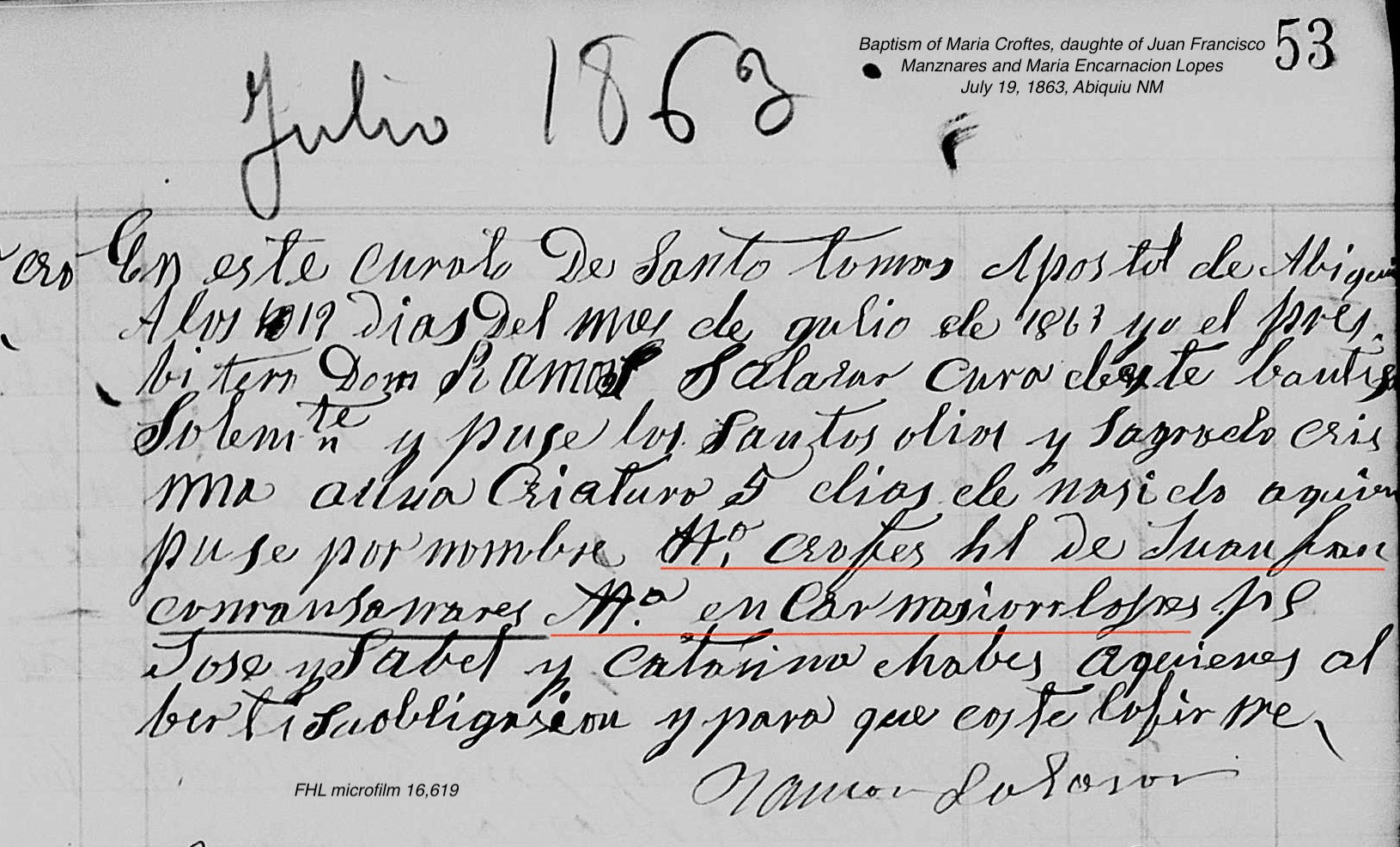 Maria Crofes MANZANARES Baptism: July 19, 1863 28 30 — Santo Tomás Apóstol, Abiquiu, Rio Arriba, New Mexico |