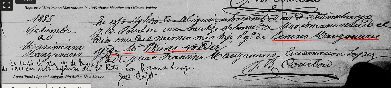 Jose Benino MANZANARES Baptism: December 15, 1889 29 24 — Santo Tomás Apóstol, Abiquiu, Rio Arriba, New Mexico |
