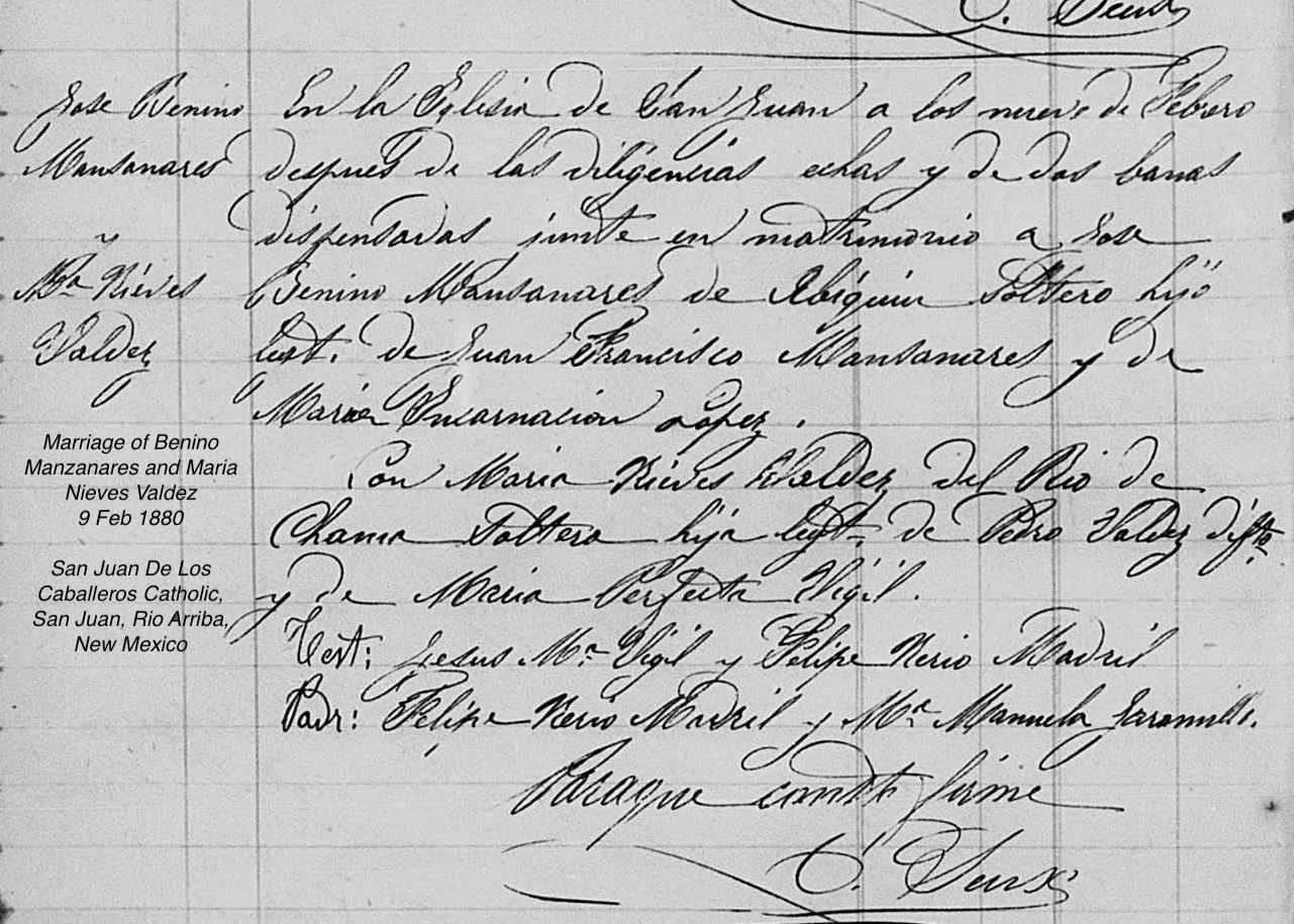 Census | 1880 (Age 19 years) 1880 Census Abiquiu NM, Manzanares Families Note: On the same page, the census lists families of Benino, his father Juan Francisco , and his grandfather Antonio (all) Manzanares. It also shows Antonio, at the age of 80, had a new wife Isidora and two small children.