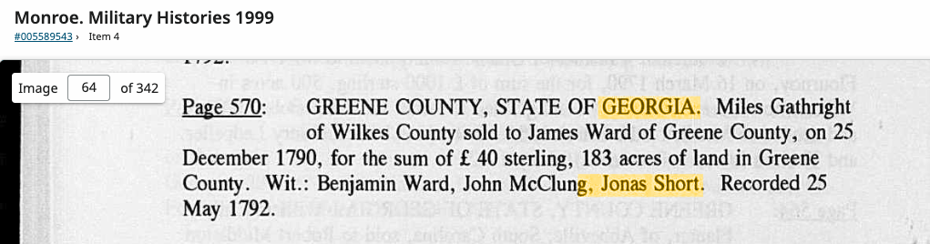 | Residence | Jonas Short was a witness to a land sale in 1792, Greene Co Ga. |