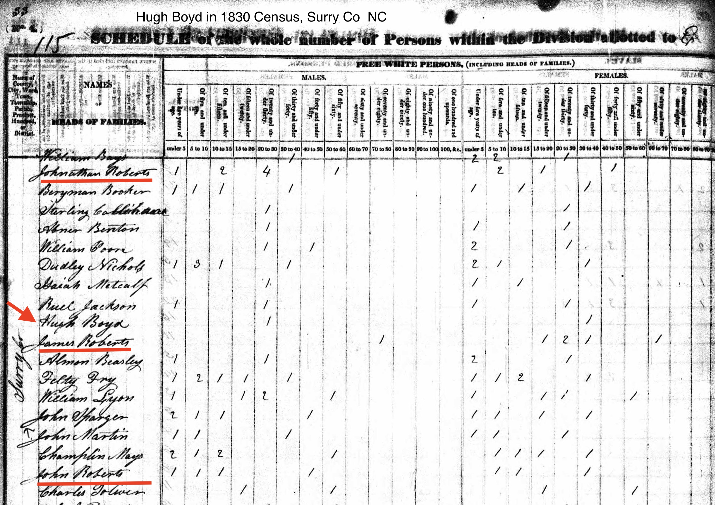 Census | 1830 (Age 23 years) Note: Hugh Boyd and his new wife lived next door to James Roberts, age 70-80. It ls likely James Roberts was Hugh's uncle, brother to Hugh's mother Mary Roberts.