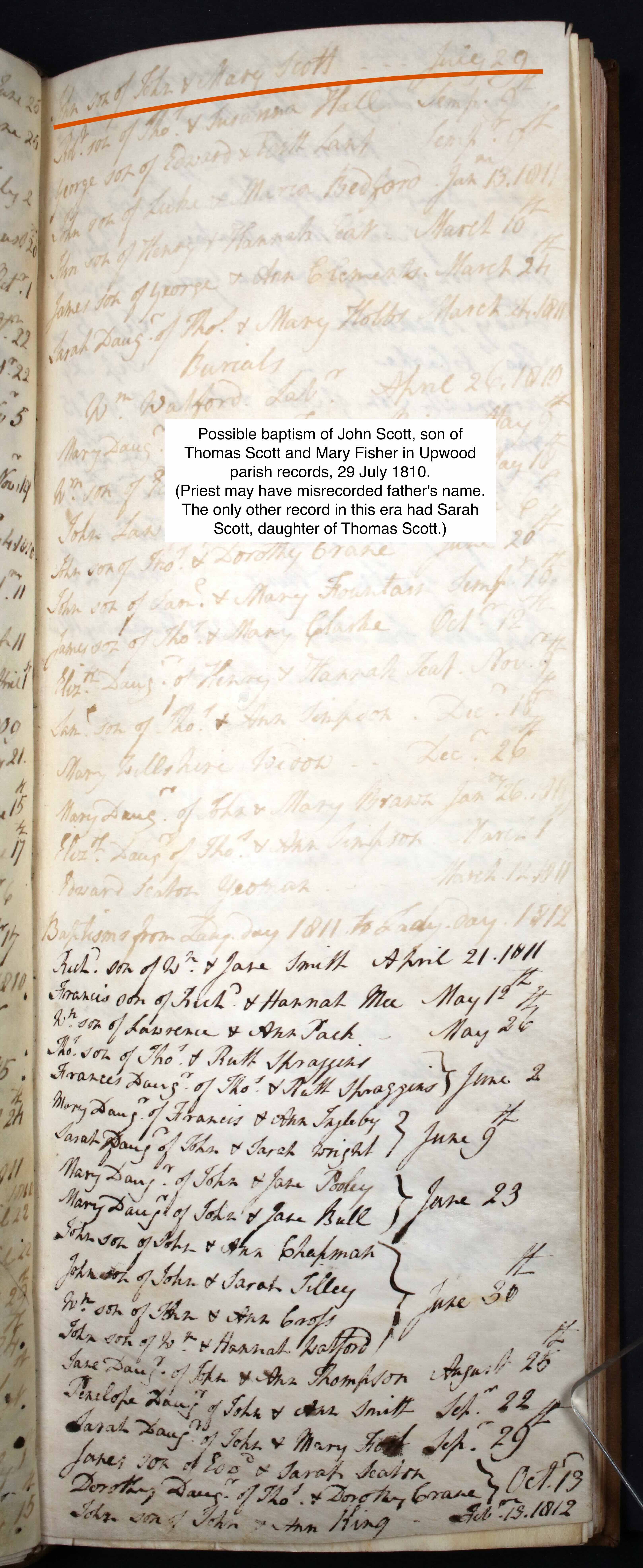 Baptism of a son | John SCOTT July 29, 1810 (Age 29 years) Shared note: Thomas Scott and Mary Fisher must have moved (returned) to Huntingdonshire after their marriage in Graveley in 1806. Their first three children Sarah, John and Elizabeth, were not born in Cambridgeshire as is reflected in the 1841 census for each and confirmed in parish records of Upwood and Great Reveley in Hunts.