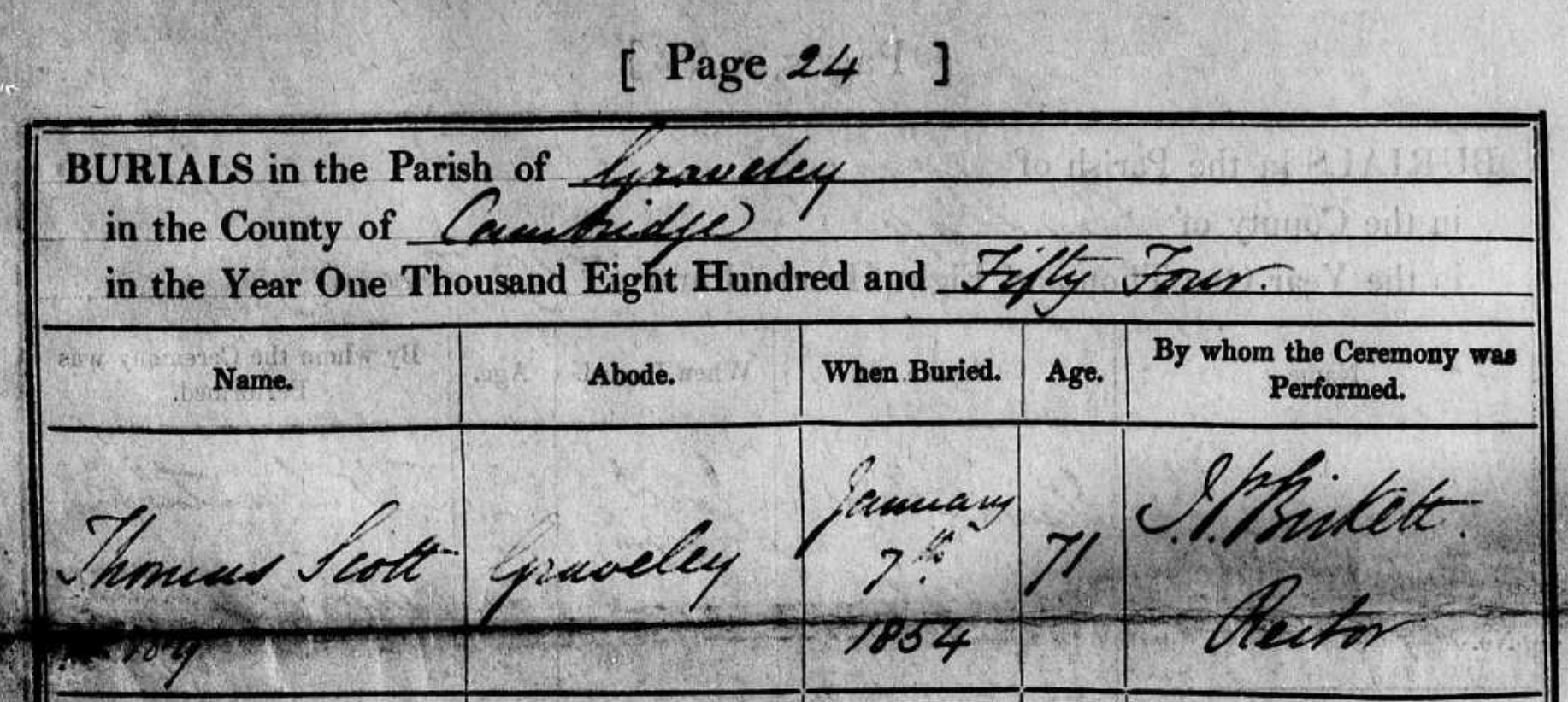 | Death | Burial Records for Graveley: Jane Scott 49, 17 Mar 1845 Thomas Scott 71, 7 Jan 1854 Mary Scott 80, 11 Jan 1855 (Union House, St Neots) |