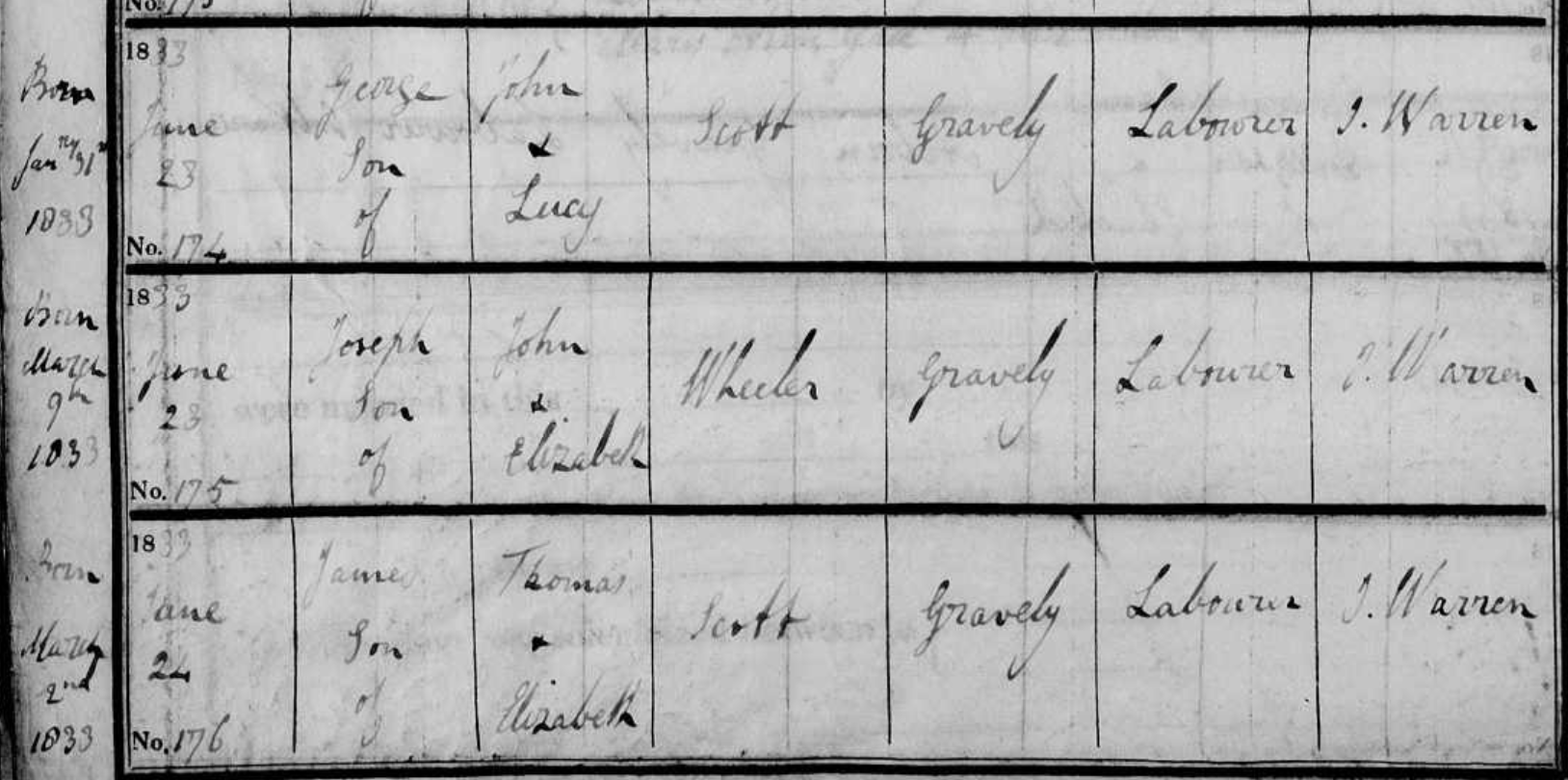 Birth of a son#4 | James SCOTT about 1833 (Age 52 years) Possible Baptism Record of James, son of Thomas & Jane Scott Note: This is the only James Scott born in Graveley in this time frame. The name of the mother is Elizabeth and there is another record of a girl named Mary Scott born to a Thomas & Elizabeth Scott in 1831. It is possible (likely) that the name Elizabeth is an error because there is no other Thomas Scott married in Graveley and young James Scott, 9, is listed in Thomas & Jane Scott's family in the 1841 census. The baby Mary Scott had died in 1835.