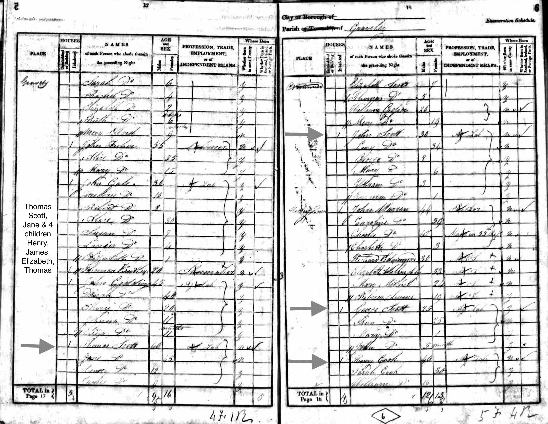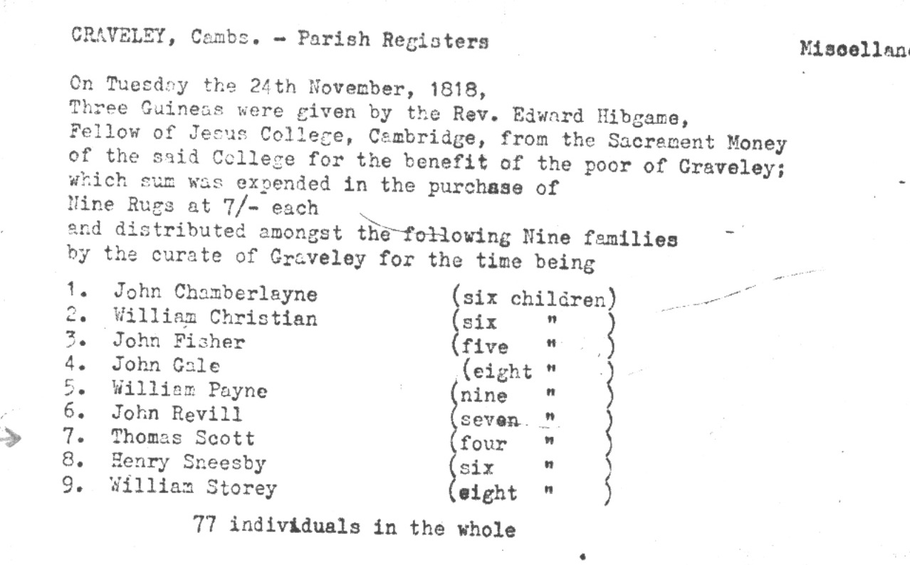 | Census | From the Graveley Parish Register in the Society of Genealogist in London: In 1818 the parish priest made a census of Graveley which lists the entire adult population. Thomas Scott is the only resident whose surname was Scott. He is a laborer with a wife and four children. The parish records also record the fact that in 1818 Thomas Scott was one of several poor families who received parish aid. |