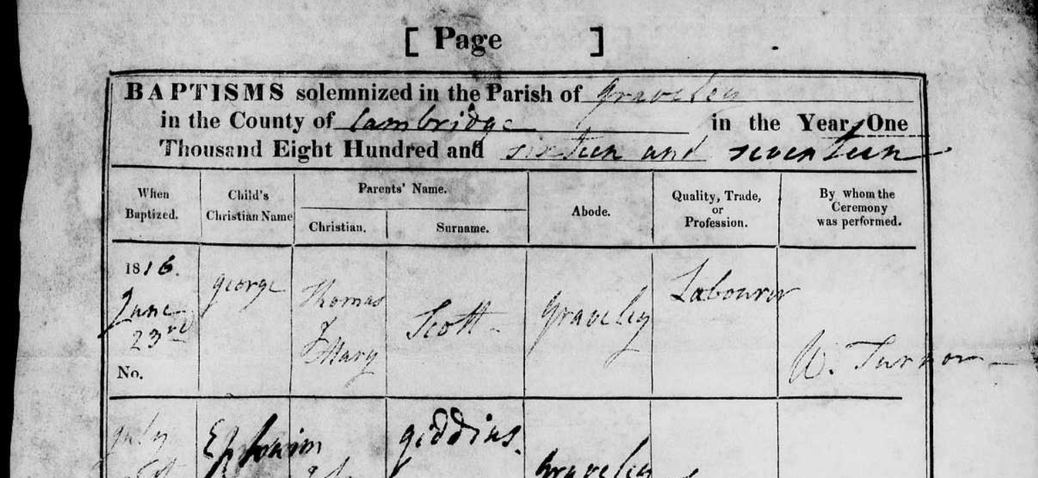 | Note | It is entirely possible that there were two Thomas Scotts in the parish or that Thomas had two wives previous to his marriage to Jane Brains in 1828. Graveley parish records show he buried a wife named Sarah in 1822. Oct 13, 1806 Thomas Scott otp married Mary Fisher. 1814 Elizabeth Scott bap. daughter of Thomas and Sarah - Fowlmere. 1816 George Scott bap. son of Thomas and Mary - Graveley. Jan 10, 1822 Sarah Scott, age 36, buried, wife of Thomas. Sept 12, 1825 Sarah Scott otp married Henry Cook otp. 1826 Elizabeth Scott, 13, Graveley, buried. Yes, there were two Thomas Scotts in the records. A Thomas Scott with wife Sarah was from Fowlmere where they had children recorded, |