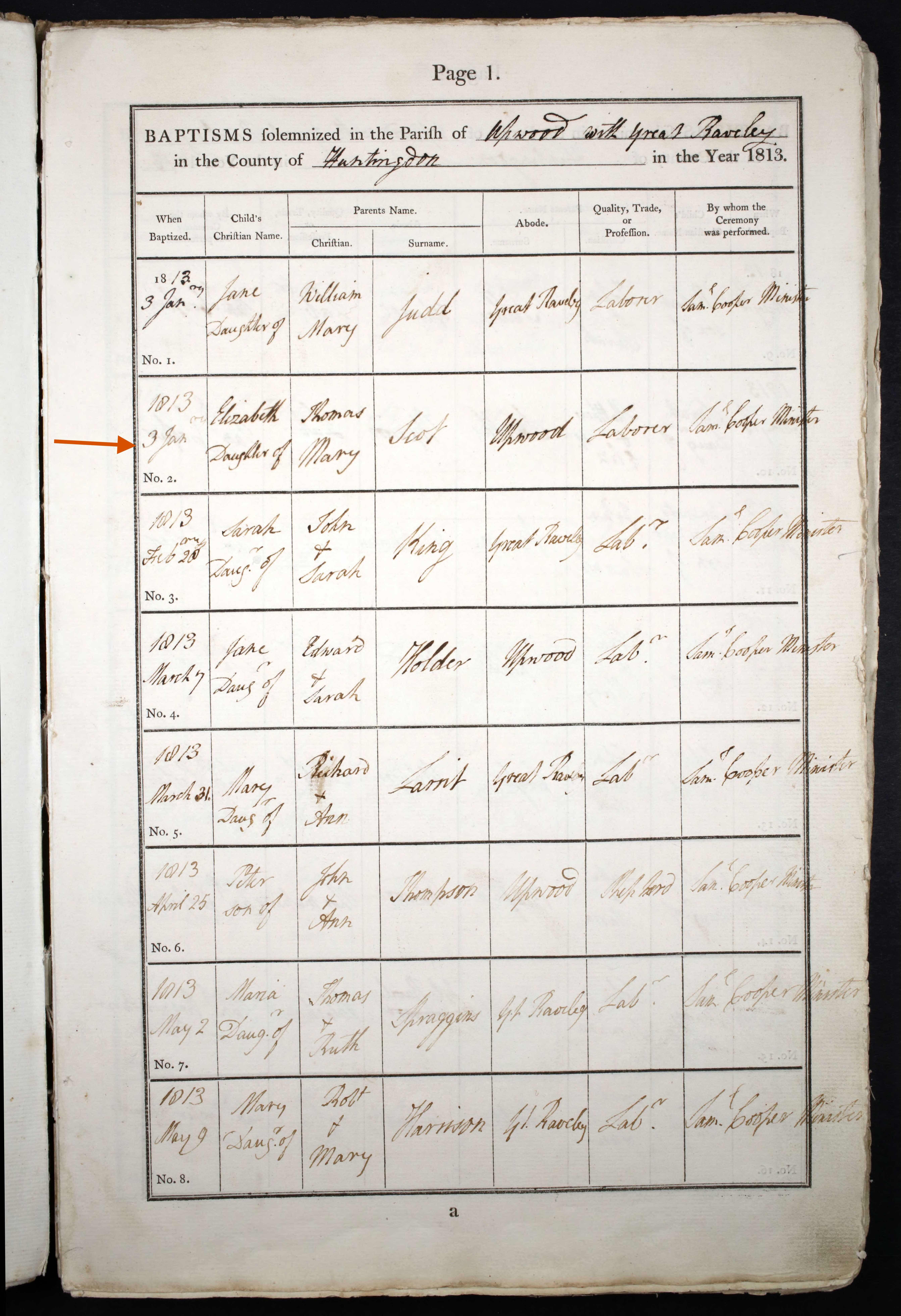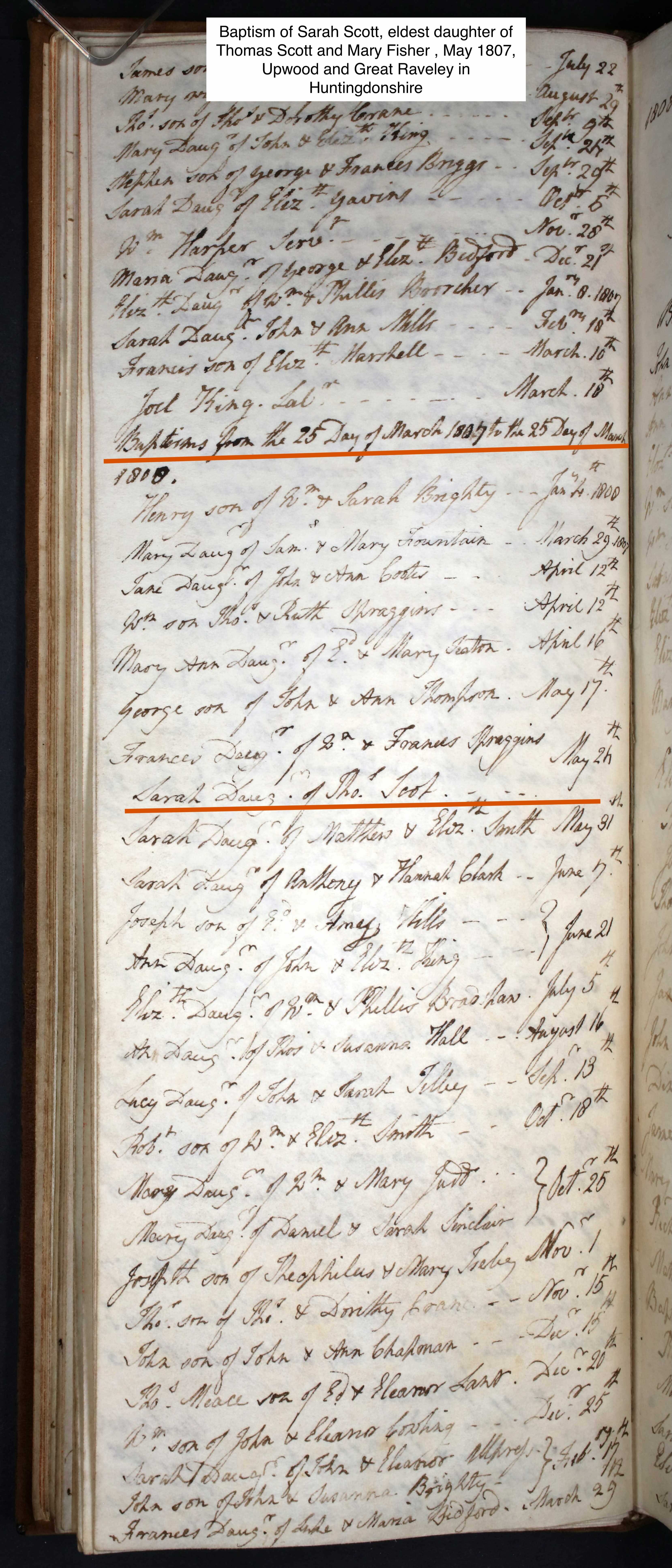Birth of a daughter#1 | Sarah SCOTT May 1807 (Age 26 years) Shared note: Thomas Scott and Mary Fisher must have moved (returned) to Huntingdonshire after their marriage in Graveley in 1806. Their first three children Sarah, John and Elizabeth, were not born in Cambridgeshire as is reflected in the 1841 census for each and confirmed in parish records of Upwood and Great Reveley in Hunts.