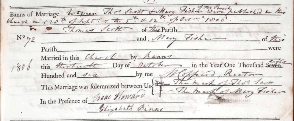 | Marriage | Thomas Scott's first marriage - from Graveley Parish Registers: Marriage, Oct 13,1806: Thomas Scott and Mary Fisher Witnesses: Isaac Howard and Elizabeth Binns |