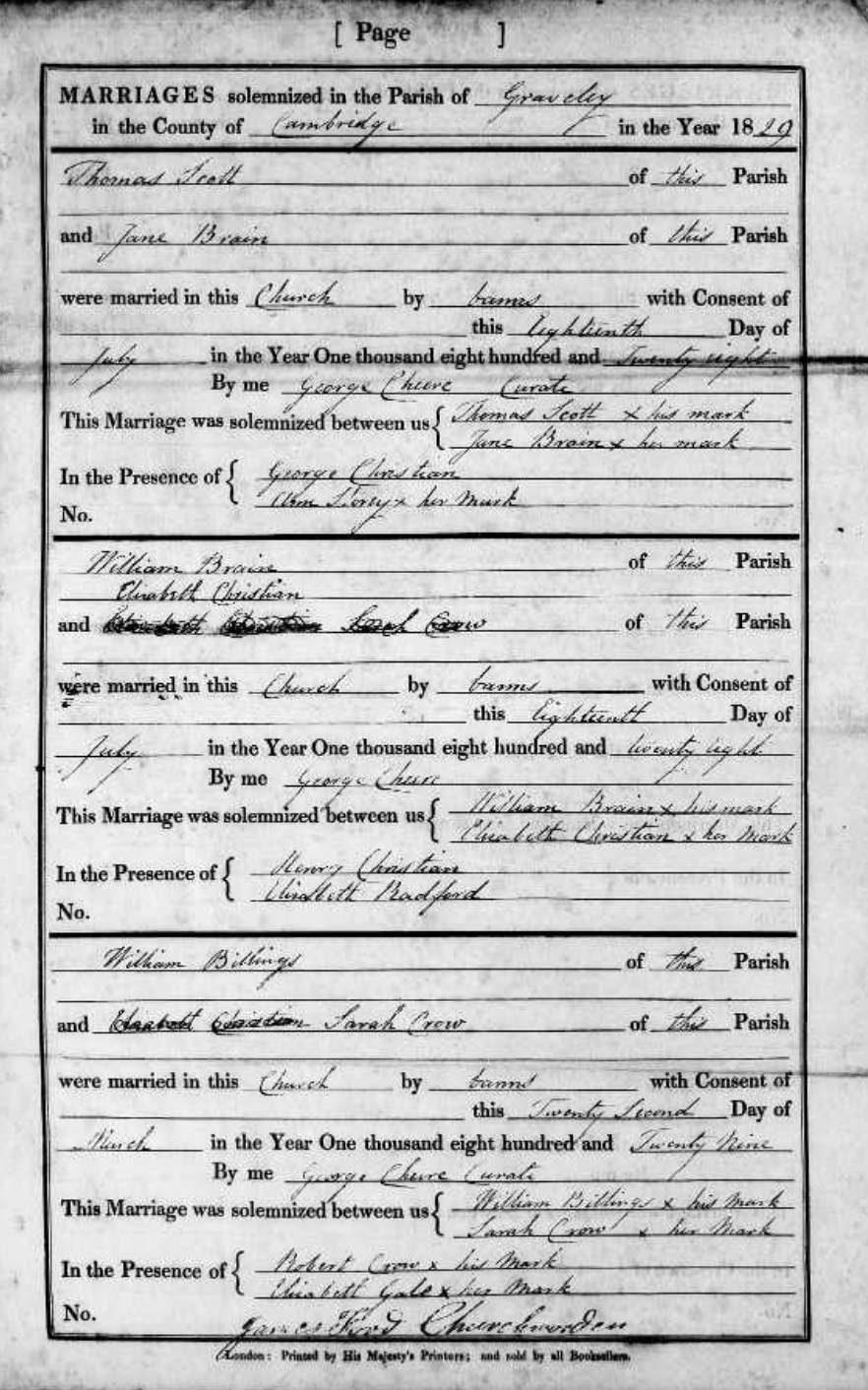 | Marriage | After Mary died Thomas Scott remarried: From the Cambridgeshire: - Registers of Marriages, 1538-1837 Marriages at Curry Rivel, 1642 to 1812. Marriages at Graveley, 1599 to 1837. Volume 4. County: Cambridgeshire Country: England Thomas Scott & Jane Brain 18 Jul 1828 |