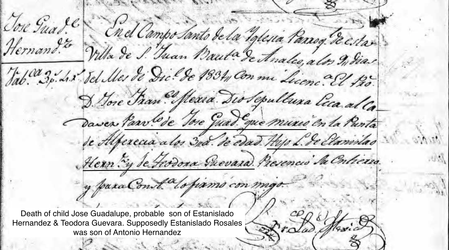 | Name | In all Chihuahua records his name was given as Estanislado Rosales or Cruz Rosales. The 1879 marriage record of his daughter Ildefonsa stated her grandparents were Antonio Ernandez & Joaquina N. In the Durango records Estanislado was known as Estanislao Orona in his marriage record, then Hernandez, and then, in a 1842 marriage record of his daughter Maria del Refugio, as Estanislado Rosales. Since he was born out of wedlock and he later took the surname Rosales, not Hernandez, it is likely his father was not Antonio Hernandez. |