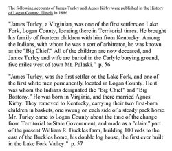 | Residence | From the Find A Grave entry for James Turley, Carlyle Cemetery, Logan Co, IL: James Turley took out an entry of land in present day Logan Co, ILL on 28 Nov 1824. The area was called Lake Fork and his was one of the first three white families there. He was the arbitrator for the Indians and they called him "Big Chief" or "Old Boss Tone". He made application for a Revolutionary War pension 18 Sept 1832 in Sangamon Co. ILL at the age of 71. He served in the Revolution three times. He stated he served the first time when a resident of Fairfax Co. VA and served twice when a resident of Henry Co. VA. He married his wife Agnes Kerby 10 May 1781 in Henry Co. VA. |