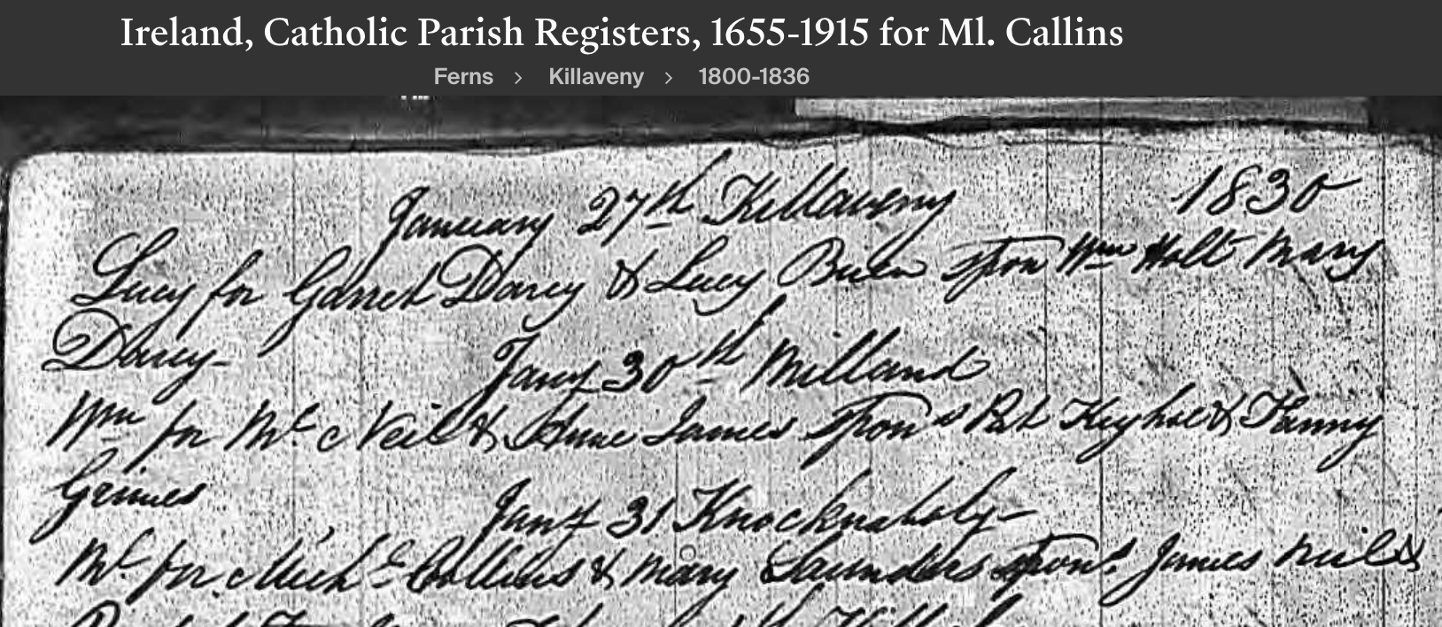 Michael COLLINS Birth: January 31, 1830 28 — Knocknaboley, Killaveny RC Parish, Wicklow |