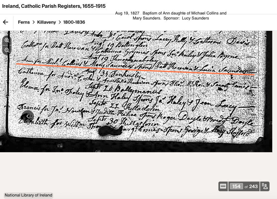 Mary COLLINS Baptism: August 7, 1825 23 — Killaveny RC Parish, Wicklow |
