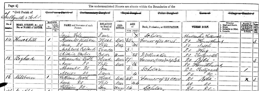 | Census | William Booth Jr and Family appear next to Alexander Booth in Tullynessle. |