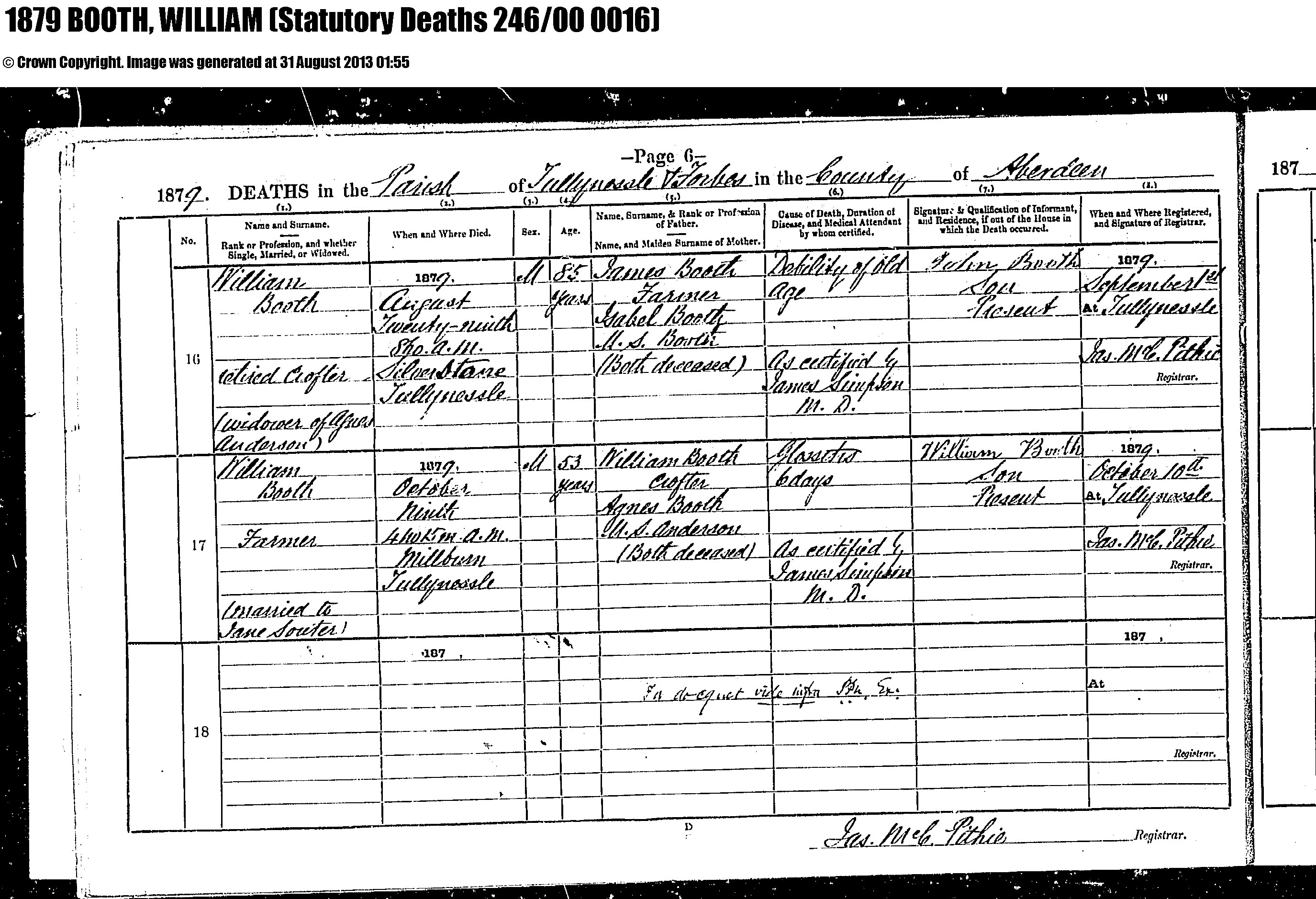 Death of a husband | William BOOTH Jr October 9, 1879 (Age 52 years) Note: William Booth Jr died the same year as his father in Tullynessle.