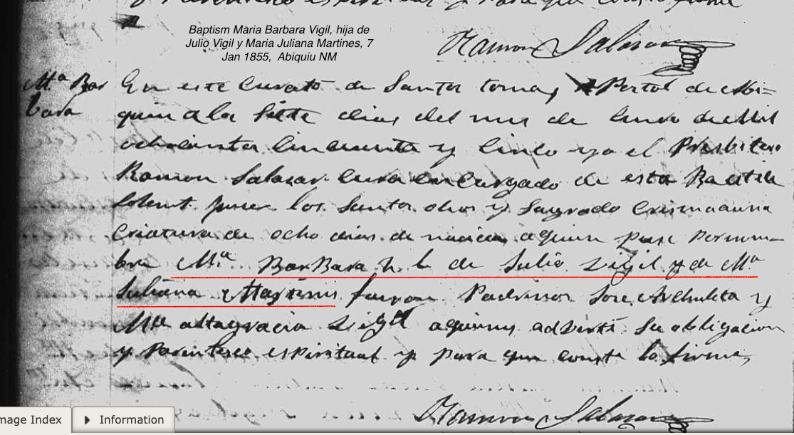 Barbara VIGIL Baptism: January 7, 1855 33 24 — Santo Tomás Apóstol, Abiquiu, Rio Arriba, New Mexico |