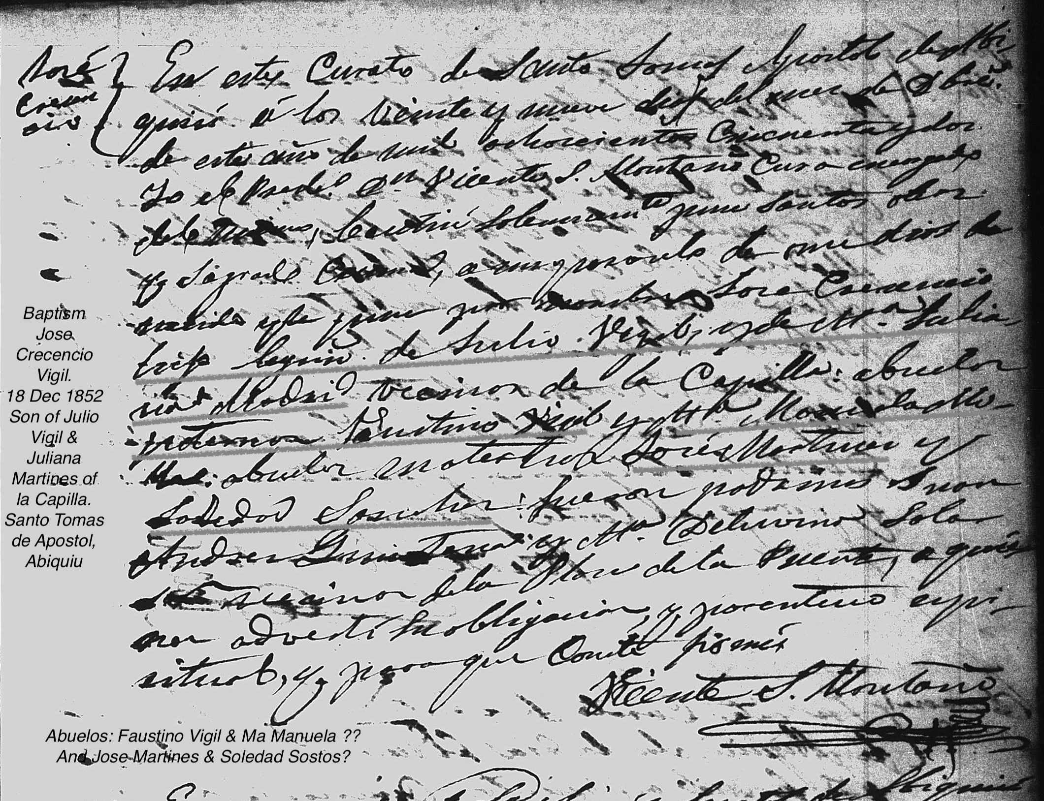 | Baptism | Baptism of Jose Crecencio Vigil, 18 Dec 1852 Santo Tomas Apostol, Abiquiu, NM Parents: Julio Vigil and Maria Juliana Martines Grandparents: Faustino Vigil and Maria Manuela Jaramillo and Jose Martines and Soledad Sostos? |