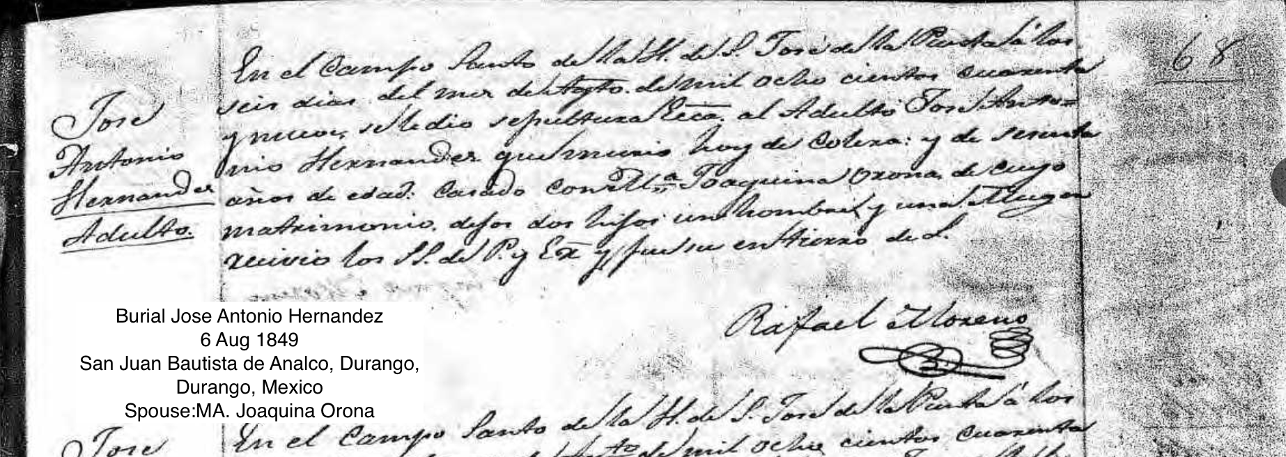 Jose Antonio HERNANDES Birth: about 1789 Burial: August 6, 1849 — San Juan Bautista de Analco, Durango, Durango, Mexico |