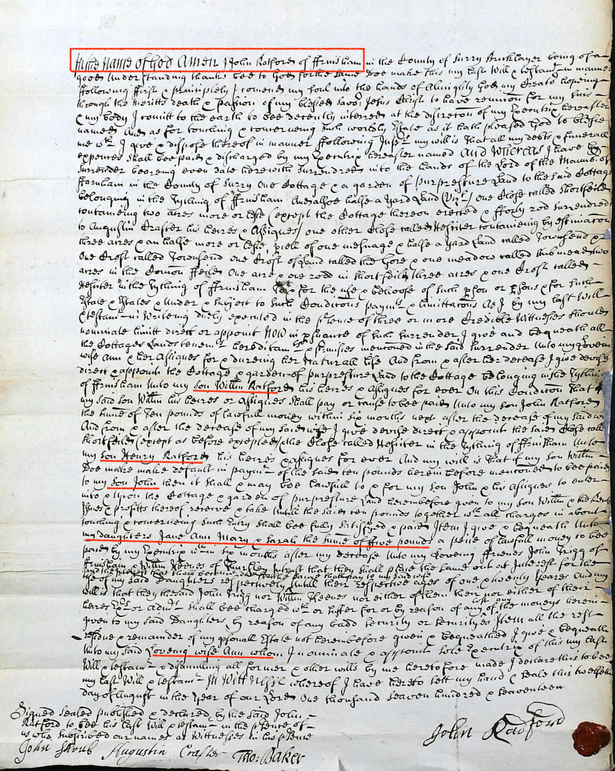 Death of a father | John RADFORD August 17, 1717 (Age 13 years) John Radfords Will (Original) from August 1717 Note: Hard to read but the will names sons William,Henry,John; daughters Jane, Ann, Mary, and Sarah; and wife Ann. He signed the will.