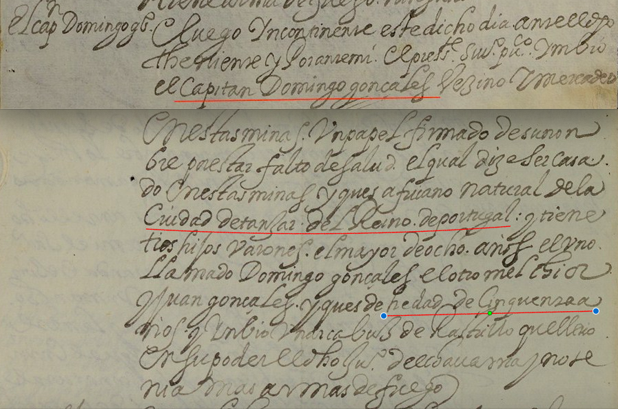 | Death | According to 1651 marriage record of his daughter Regina Captain Domingo Gonsales was deceased. Based on baptism records of his children Juan and Josepha, Domingo must have died in late 1641 or early 1642. From the book: Poblar la frontera: la provincia de Santa Bárbara en Nueva Vizcaya durante los siglos XVI y XVII, El Colegio de Michoacán, 2006 - Santa Bárbara (Mexico), by Chantal Cramaussel. (Translation) pg 385 16. González, Domingo. Tanger. Will in 1641. Merchant in San Bartolomé, married with Regina Vera, daughter of Gaspar de Vera and Maria Delgado. Widower of Ana de Grados (daughter of Andrés Cordero and Ana de Grados), who had no dowry. Sent money to the jewish merchant Francisco Franco de Moreira who was arrested by the Inquisition in 1642. Rents the hacienda of his father-in-law (Santa Catalina de Corrales)... |