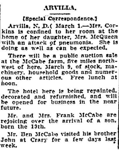 | Census | The ND state census on April 1, 1915 shows that the Frank McCabe family was back in the US, living in the city of Larimore. |