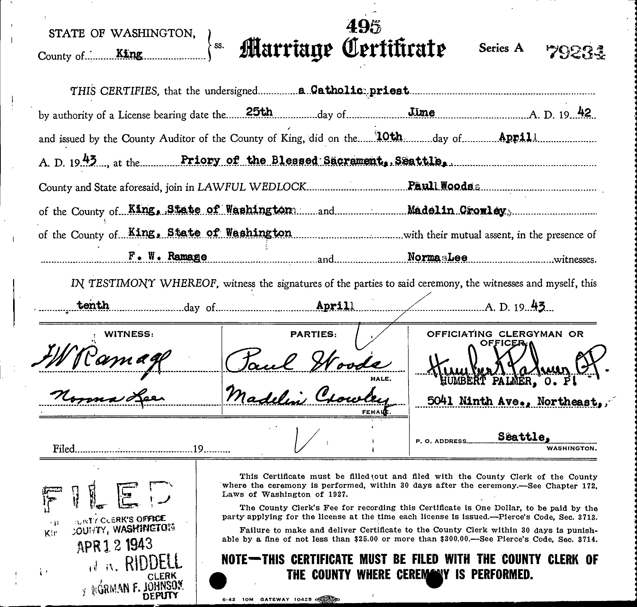 Marriage of a child | Paul WOODS — Madeline A CROWLEY — View this family October 4, 1943 (Age 62 years) |